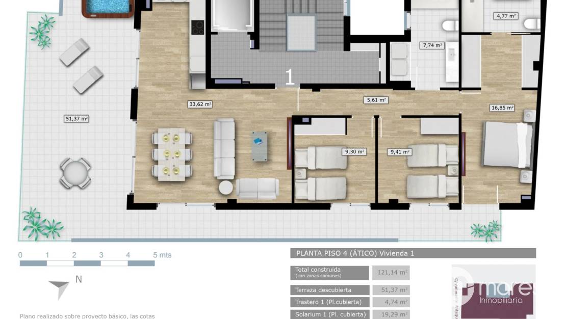 But the real star of the show is the spectacular penthouse, a place where luxury reaches another level. This exclusive space has an uncovered terrace of 51.37 m², ideal for dinners under the stars or relaxing evenings in company, and a private solarium of 19.29 m², designed to enjoy the light and calm of the Mediterranean in your own refuge.