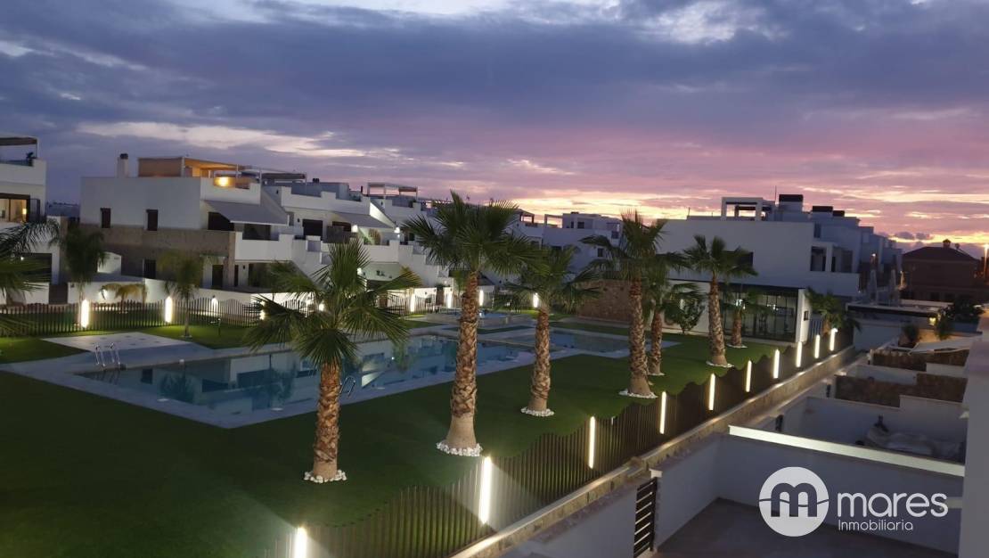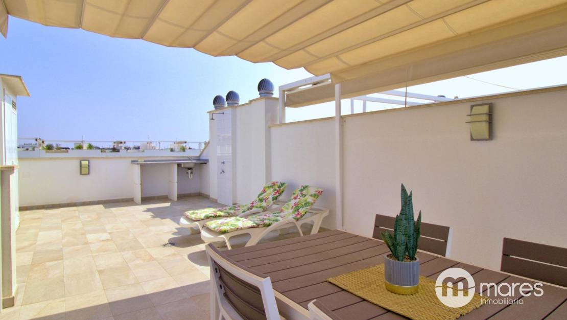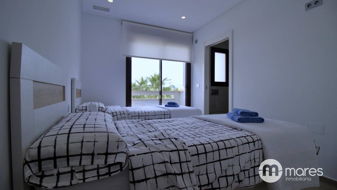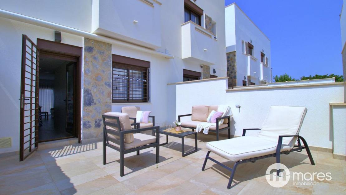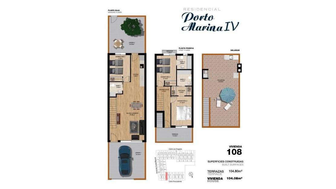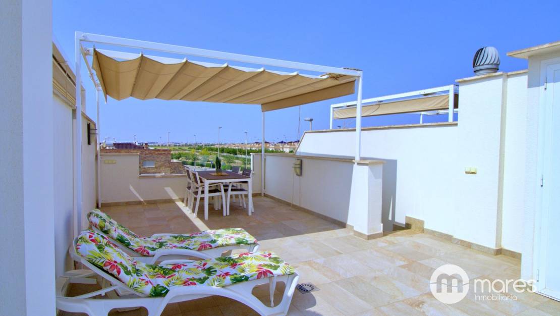 La zona exterior es uno de sus grandes atractivos: una amplia terraza trasera con acceso directo a la fantástica área comunitaria. En la planta superior, el dormitorio principal dispone de un elegante vestidor, baño en suite y acceso a un balcón que conecta con una gran terraza solárium equipada con pérgola y espectaculares vistas .