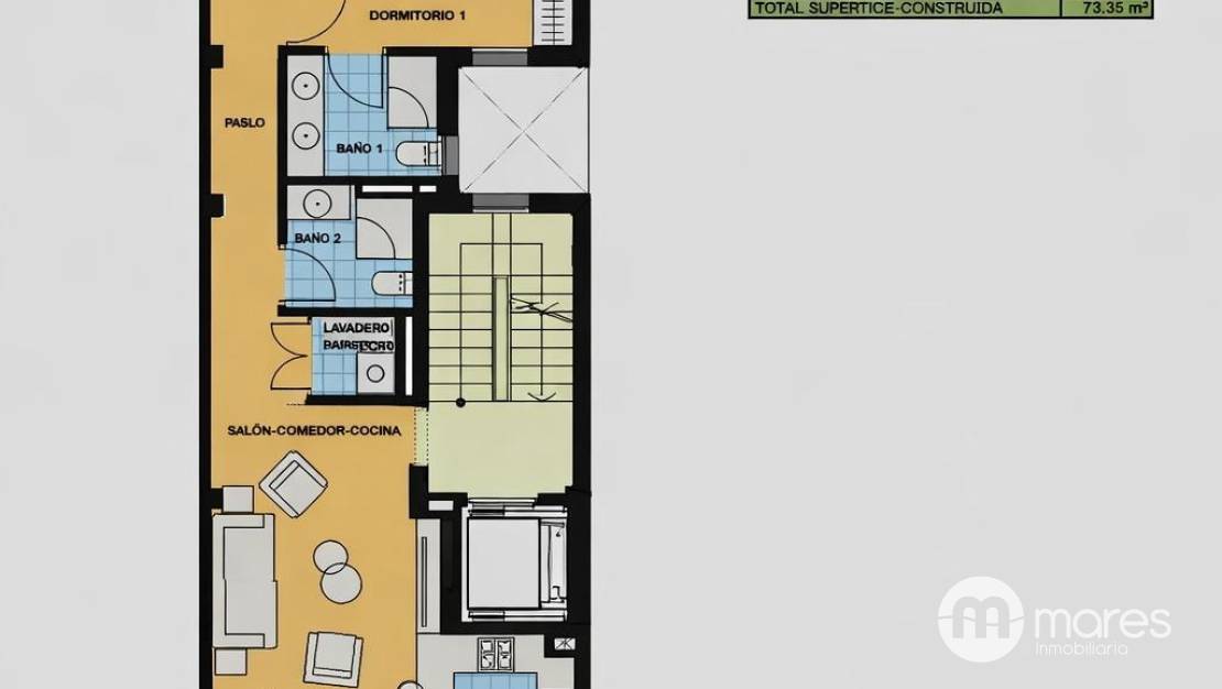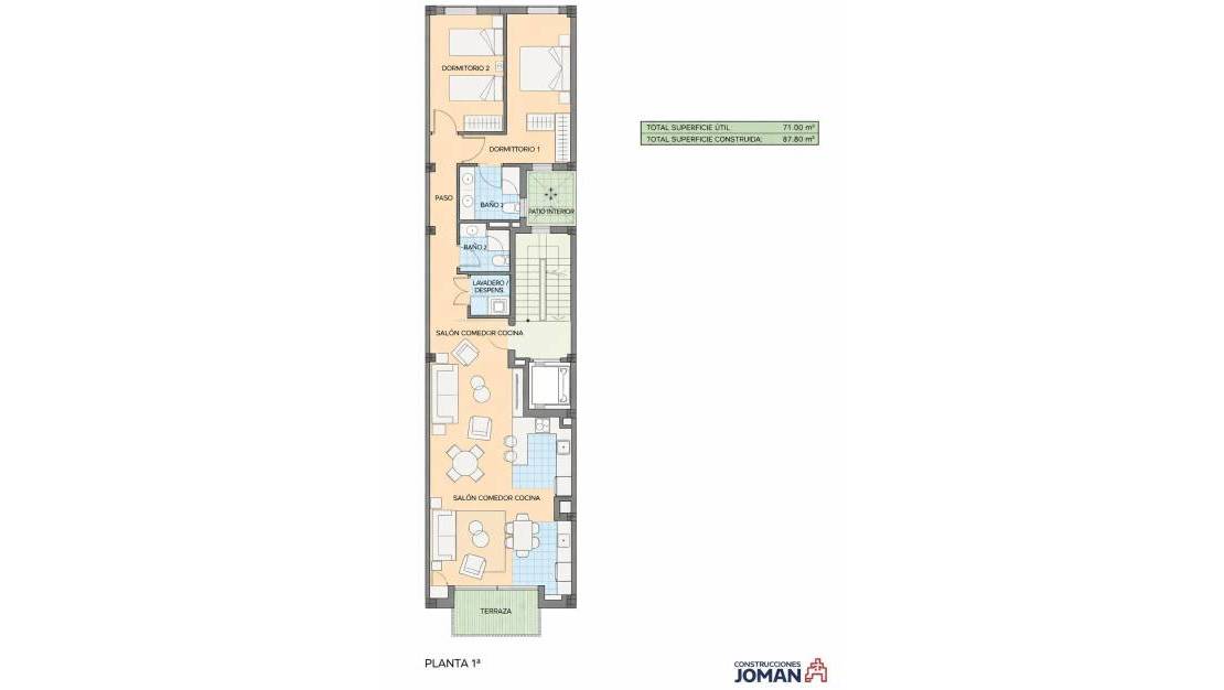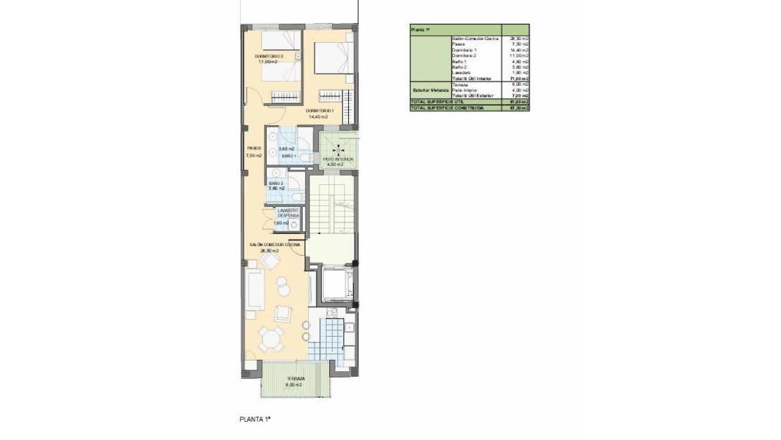 Cada piso cuenta con un amplio salón comedor y cocina semi integrada, con salida a una terraza de 6m², dos amplias habitaciones y dos baños (uno en suite). Salida a un balcón ancho desde salón, cocina muy luminosa y con una isla preciosa. Las viviendas miden unos 78 m² útiles, distribuidos inteligentemente. Complementan las características útiles los trasteros disponibles en planta sótano, con acceso directo desde ascensor, que ofrecen espacio adicional a tu disposición. Además cuenta con una piscina comunitaria en la azotea y zona relax.