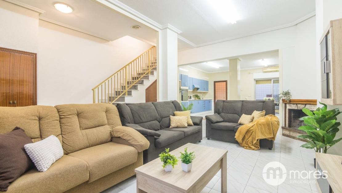 La vivienda se distribuye de manera muy funcional, en dos plantas. En la planta baja encontramos un salón amplio, luminoso, con una chimenea que aporta un ambiente cálido y acogedor, dispone de cocina integrada, que ofrece una distribución cómoda, ideal tanto para el día a día como para reuniones familiares, con cuarto de lavado independiente. La estancia conecta mediante una gran escalera con el resto de la planta de arriba, ofreciendo una sensación de hogar práctico y bien aprovechado.