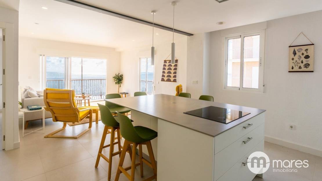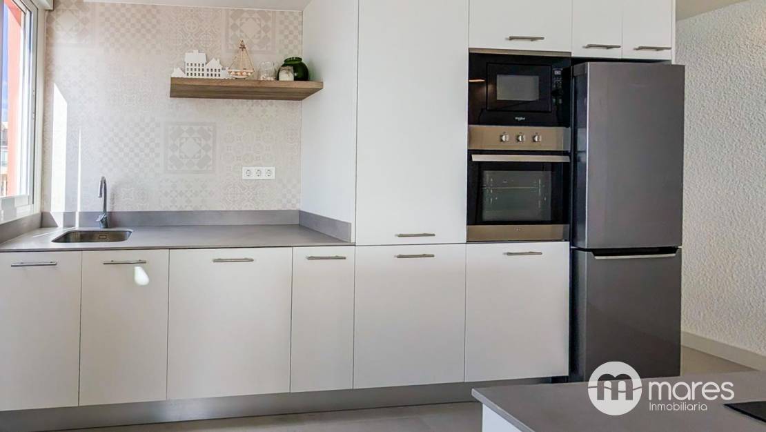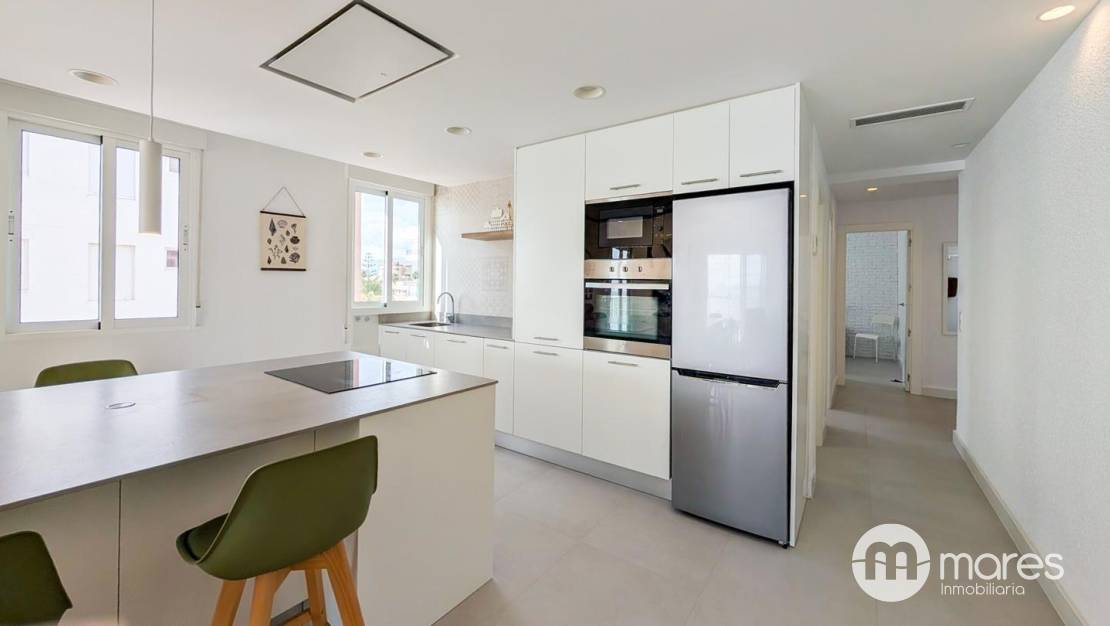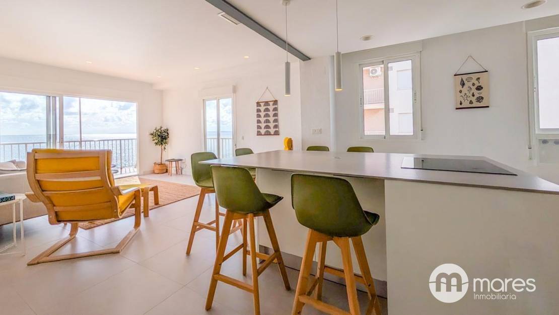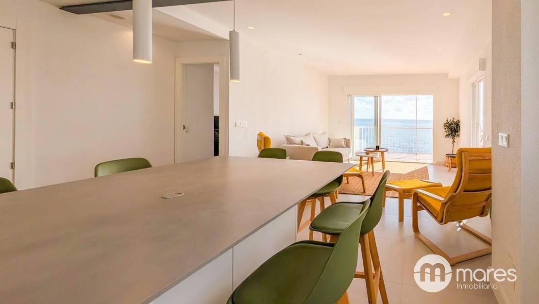La vivienda, ubicada en la tercera planta de un edificio con ascensor, cuenta con 3 dormitorios y 2 baños completos. El dormitorio principal incorpora una terraza desde la que podrás contemplar amaneceres únicos frente al mar. El salón–comedor y la cocina americana conforman un amplio espacio abierto, elegante y funcional, equipado con una gran isla central ideal para compartir momentos en familia o con amigos. Dispone además de una galería independiente que aporta mayor comodidad en el día a día.