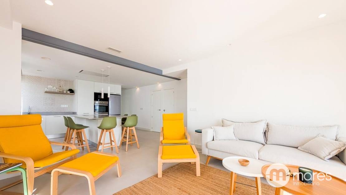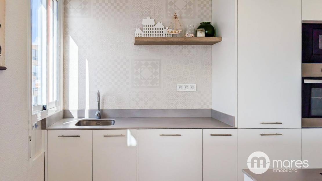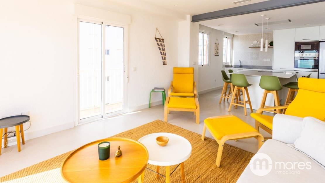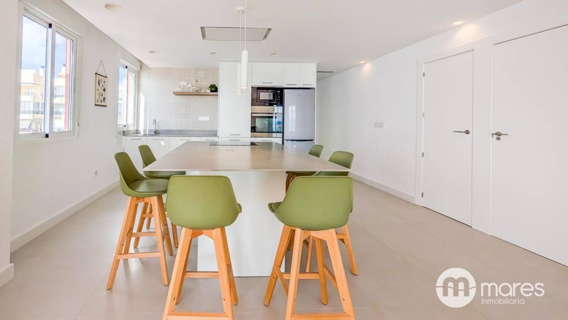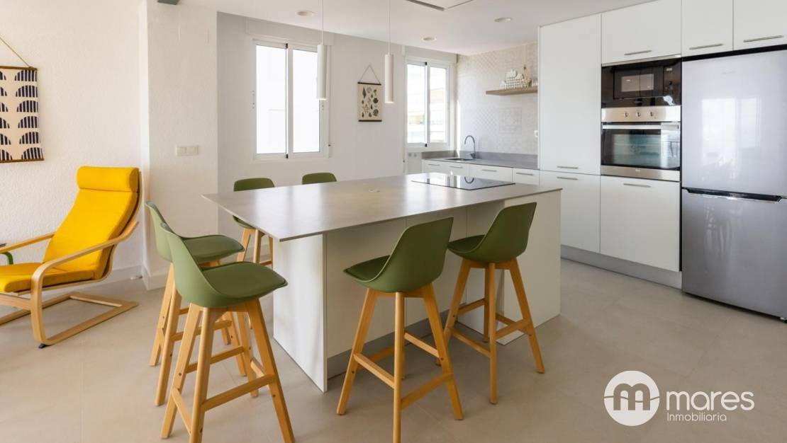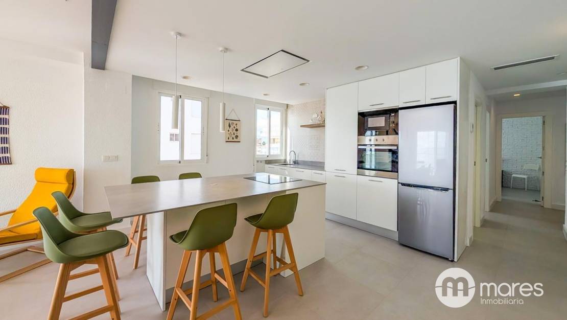 La vivienda, ubicada en la tercera planta de un edificio con ascensor, cuenta con 3 dormitorios y 2 baños completos. El dormitorio principal incorpora una terraza desde la que podrás contemplar amaneceres únicos frente al mar. El salón–comedor y la cocina americana conforman un amplio espacio abierto, elegante y funcional, equipado con una gran isla central ideal para compartir momentos en familia o con amigos. Dispone además de una galería independiente que aporta mayor comodidad en el día a día.